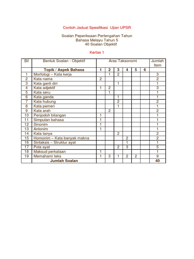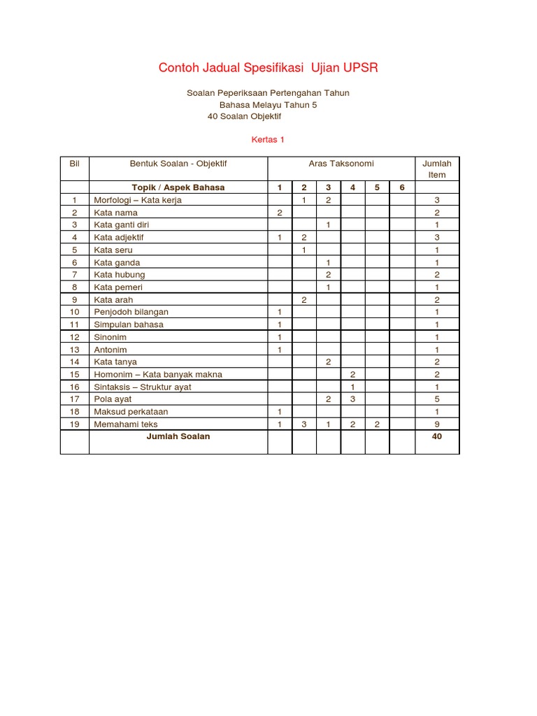 Doc Jadual Spesifikasi Ujian Bahasa Melayu Tahun 6 Hamzi Esahal Academia Edu